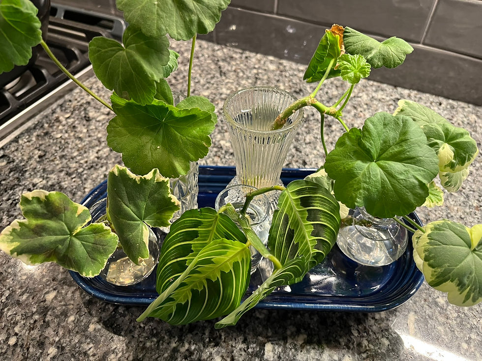 This is a progress update on the little plant slips I brought home from my trip to Wyoming. I'm pleased to report that in less than three weeks roots are growing! I took a few minutes to refresh the water in the little vases and checked the status.